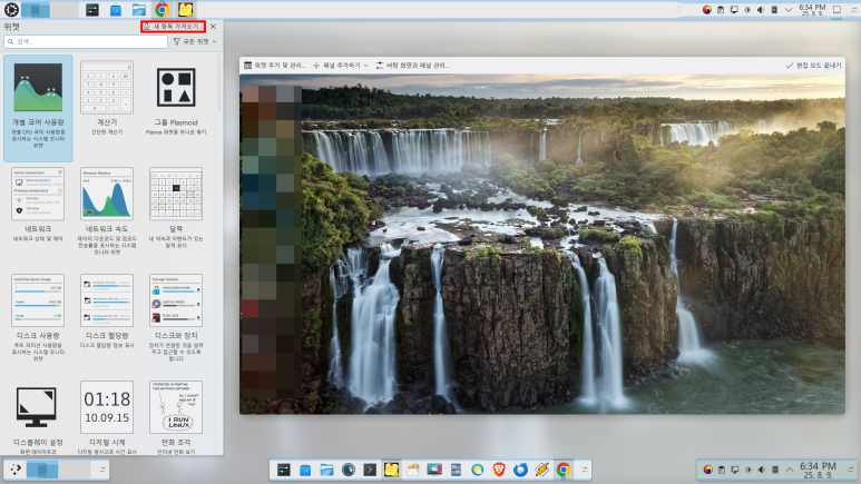 (5) 다운로드한 plasmoid-panel-colorizer-v4.3.2.plasmoid 파일을 불러들인 후, 검색란에 'panel colorizer'를 입력해 'Panel colorizer'을 찾은 다음 마우스로 클릭해 패널에 위젯을 추가한다.