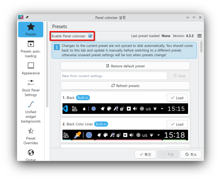 (6) 패널을 마우스 오른쪽 버튼 클릭해서 'Panel colorizer 설정' 메뉴를 선택한다. 나타난 창에서 'Enable Panel colorizer' 옵션을 체크하여 활성화 한다.
