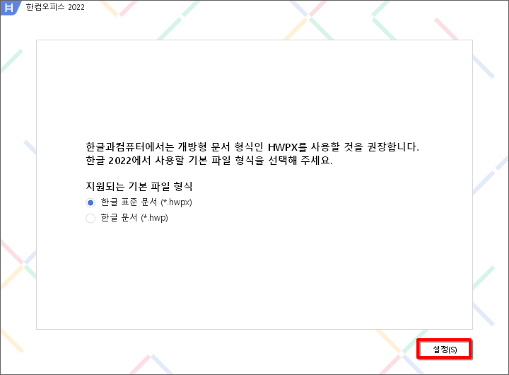 (11) '한글 표준 문서 '를 선택하고 '설정' 버튼을 클릭한다.