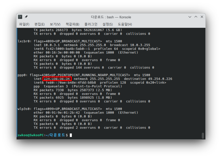 (7) 설정된 고정 IP 주소는 ifconfig 를 실행시켜 ppp0 인터페이스를 확인한다.