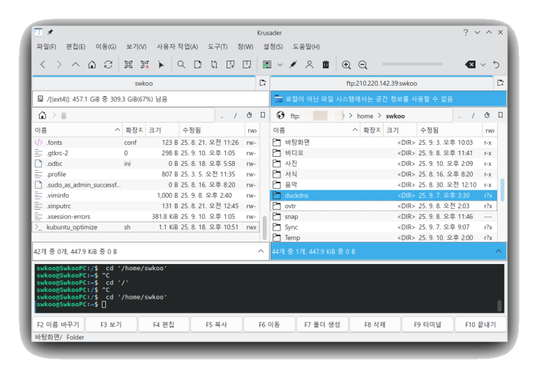 *KDE 환경에서 FTP 접속을 하려면 Filezilla, Krusader, Dolphin이 있는데 Filezilla는 한글이 깨지는 단점이 있고 FileZilla와 유사한 환경을 제공하는 것이 KDE 전용의 Krusader이다. Krusader는 더블 패널 파일 관리자로서 FTP, SFTP, SMB, NFS를 지원한다.