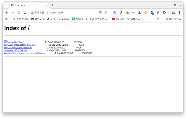(6) 웹브라우저를 열고 http://서버IP 접속을 해 파일이 출력되는지 확인한다. 각 파일을 클릭해 다운로드할 수 있다.
