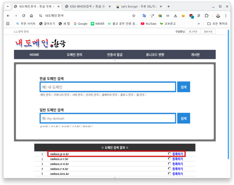 (3) '일반 도메인 검색'에 'swkoo'을 검색하자 사용할 수 있는 도메인이 검색 된다. 원하는 도메인을 선택해서 '등록하기'를 클릭한다.