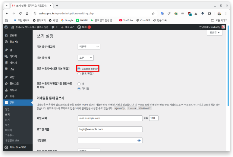 '설정 > 쓰기'로 이동해서 'Classic editor'를 선택한다.