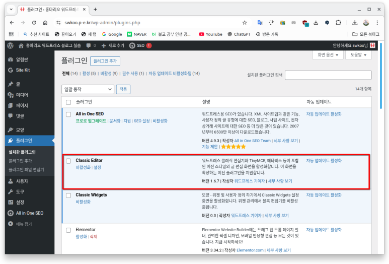 (1) '만들면서 배우는 워드프레스'는 'Classic Editor' 플러그인을 미리 설치하고 설정을 해야 한다. 그리고 워드프레스 6.3 버전을 기준으로 만들어졌다는 것을 유념해야 한다.