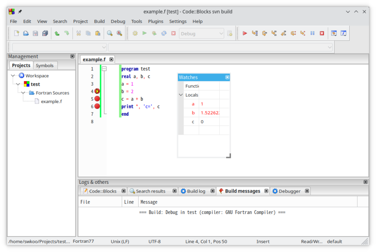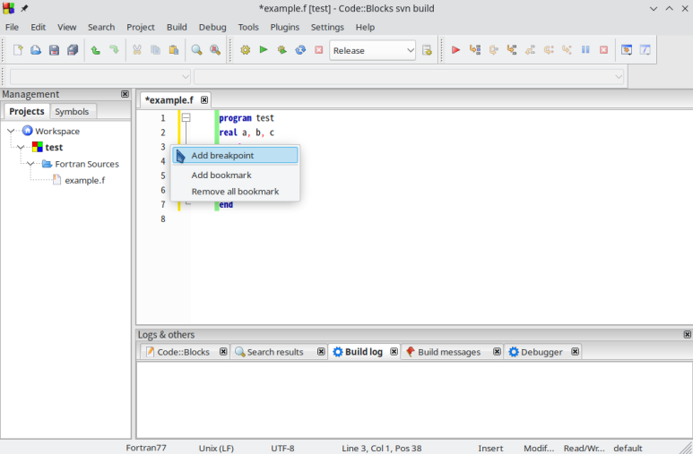 (13) 'example.f' 파일에 간단한 포트란 프로그램을 작성한 후, 중단점을 설정할 곳에 마우스 오른쪽 버튼을 눌러 팝업 메뉴에서 'Add breakpoint'를 클릭한다.