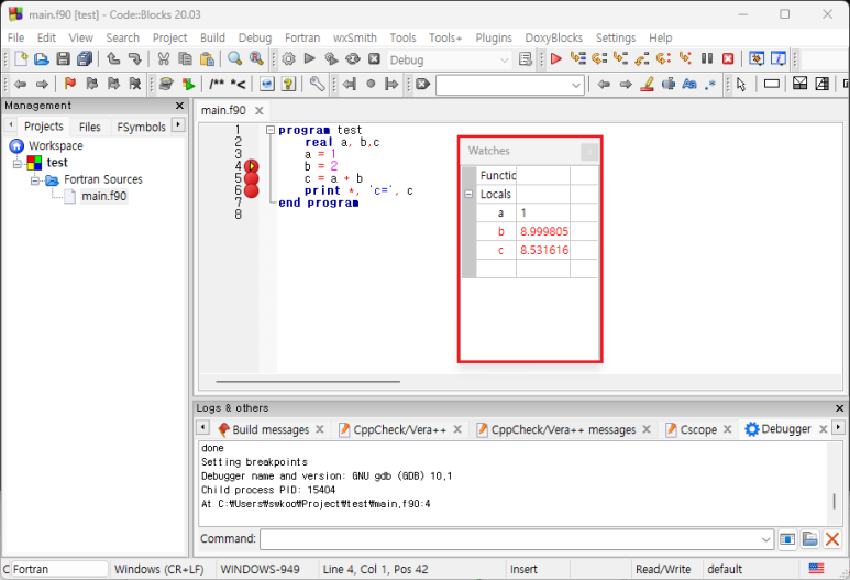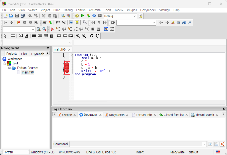 (12) main.f90 파일에 간단한 소스를 작성한 후, 중단점(break point)를 설정한다.