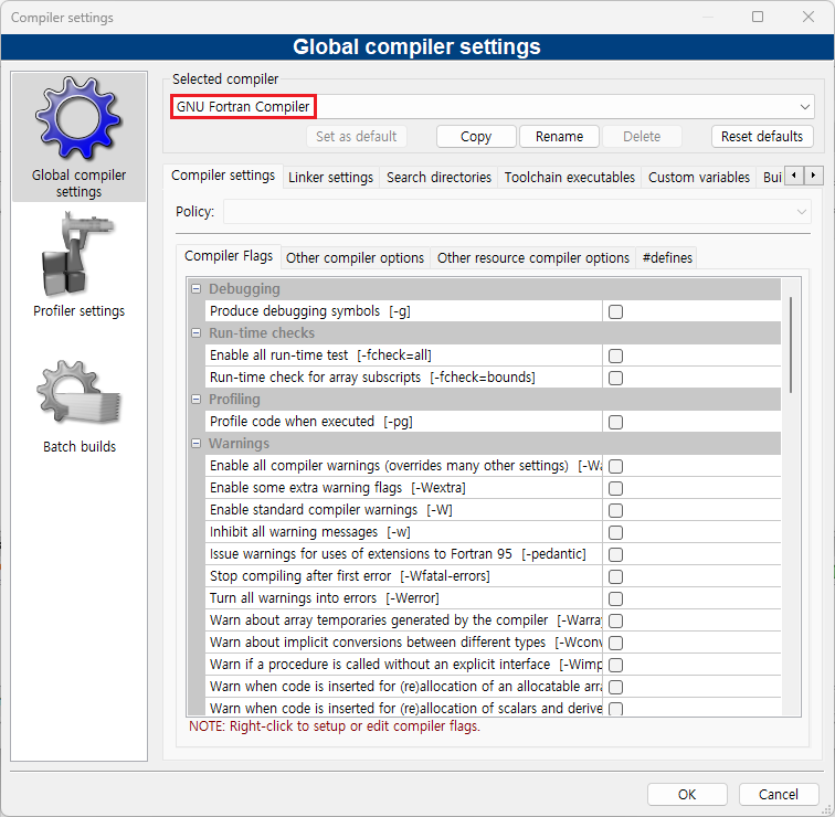 (5) Settings 메뉴에서 Compiler 서브 메뉴를 클릭한 후, 'Selected compiler'로 'GNU Fortran Compiler'를 선택한다