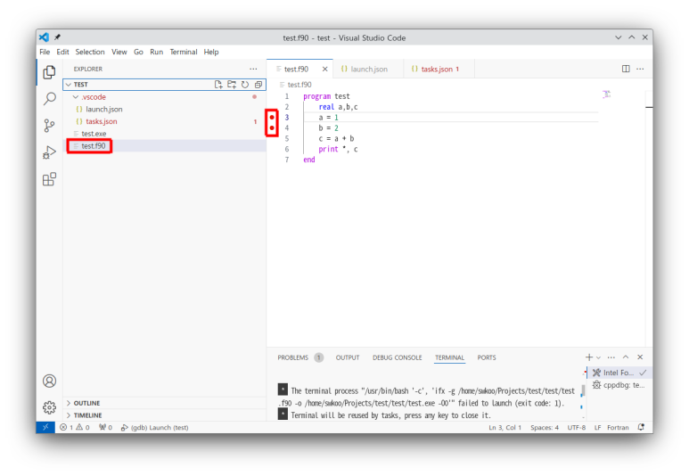 (11) 'test.f90' 파일에서 중단점을 설정한 다음, 'Run' 메뉴의 'Start Debugging' 서브 메뉴를 클릭하면 'launch.json' 파일의 내용에 따라 디버깅이 시작된다.